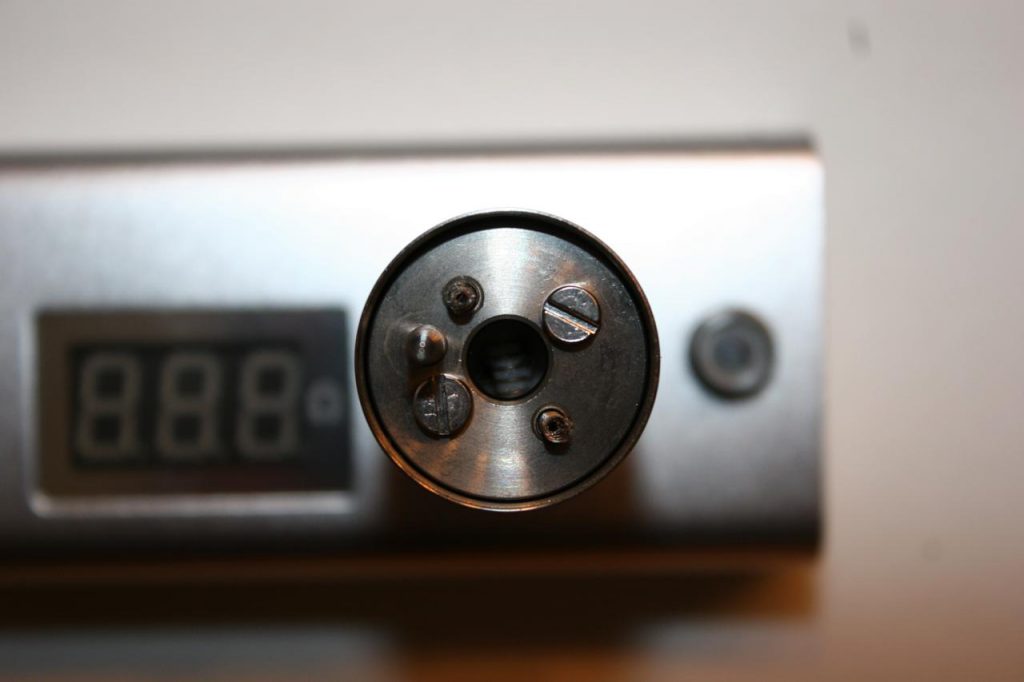 Die Base / das Deck ist an der Unterseite mit einem angedrehten 510er Anschluss versehen, in welchem sich eine Hohlschraube befindet, die den Pluspol auf dem Deck fixiert. Der Pluspol ist miteinem sehr weiten Luftloch versehen, die Wicklung wird also von unten mit Luft versorgt. Als Isolierplatte dient ein passendes Teil aus PEEK. In das Innere der Hohlschraube wird die eigentliche Polschraube eingeschraubt, die als Edelstahl-Madenschraube ausgeführt ist. Inzwischen kommt hier die Messingschraube mit O-Ring zum Einsatz, die bei den ersten ausgelieferten Verdampfern nachgeliefert wird (auf Anforderung).